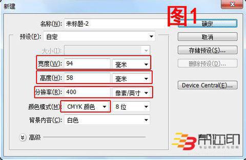 打開Photoshop,新建一個文檔,規(guī)格尺寸設(shè)置為寬度94MM,高度58MM,分辨率400,顏色模式CMYK,然后點(diǎn)擊確定。如圖1所示。