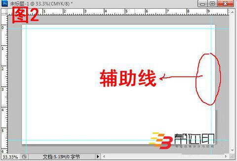 2、 在新建文檔中顯示標(biāo)尺(視圖—標(biāo)尺),然后拖拉輔助線,把出血用輔助線標(biāo)示出來,如此,設(shè)計(jì)的時候才有一個清晰的設(shè)計(jì)范圍哦。如圖2所示。有時為了輔助線的準(zhǔn)確性,可以放大圖像進(jìn)行拖拉輔助線,相對會準(zhǔn)確好多。